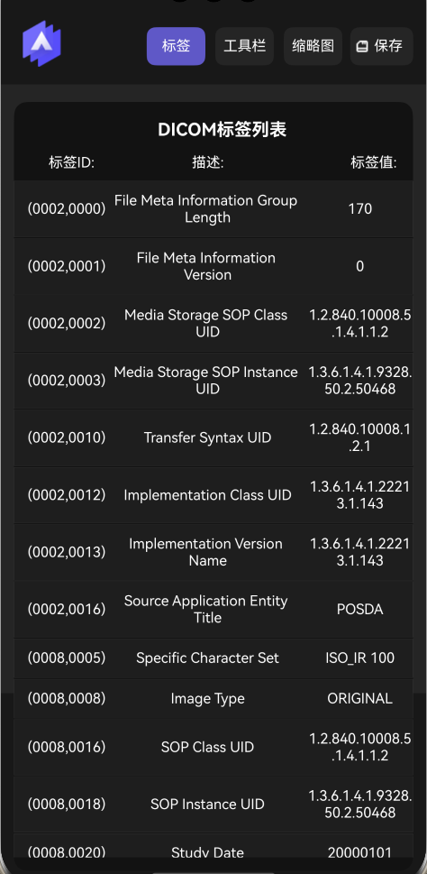 从标签下拉菜单中单击“DICOM标签”模式(或按”Ctrl+Alt+T”键),即可显示出来医学影像的标签信息。