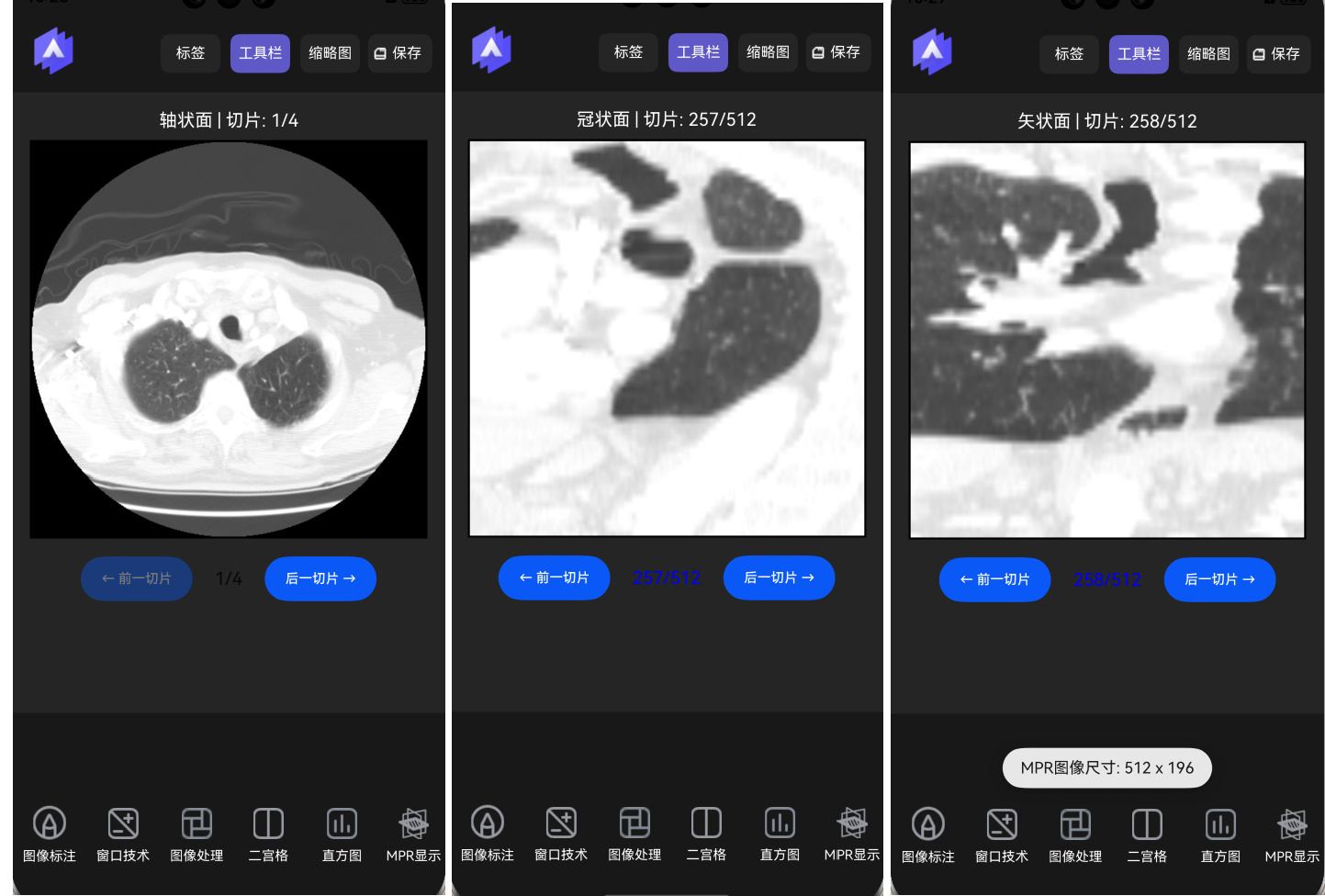 打开序列后,可以选择MPR(多平面重构)显示功能。在MPR页面会将原始的轴状面图像序列进行三维重构,拖动冠状面及矢状面的滑动条可以分别针对这两个维度在不同位置上进行切面,以形成重构出的对应图像,如下图所示。